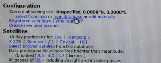 1) From the Heavens-Above home page, click on the 'from database' button and select your country then type in your home town or nearest major town if it's not listed.
